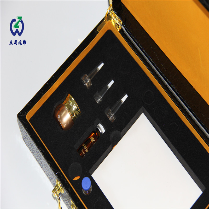 高端化妝品禮盒既需凸顯奢華質(zhì)感,又要保護(hù)易碎瓶罐,五周泡棉的黑色植絨 EVA 內(nèi)襯,完美平衡了這兩點(diǎn)需求。